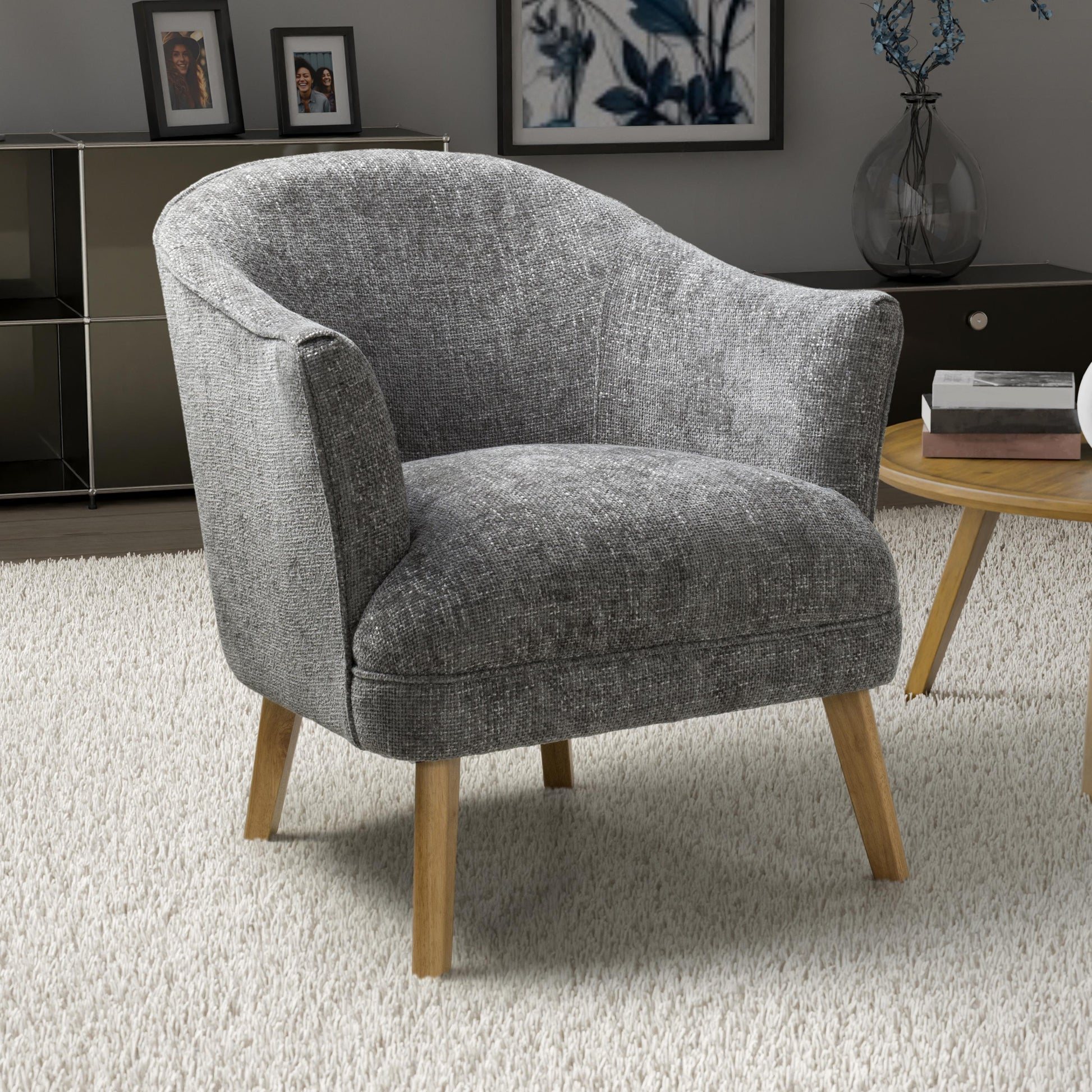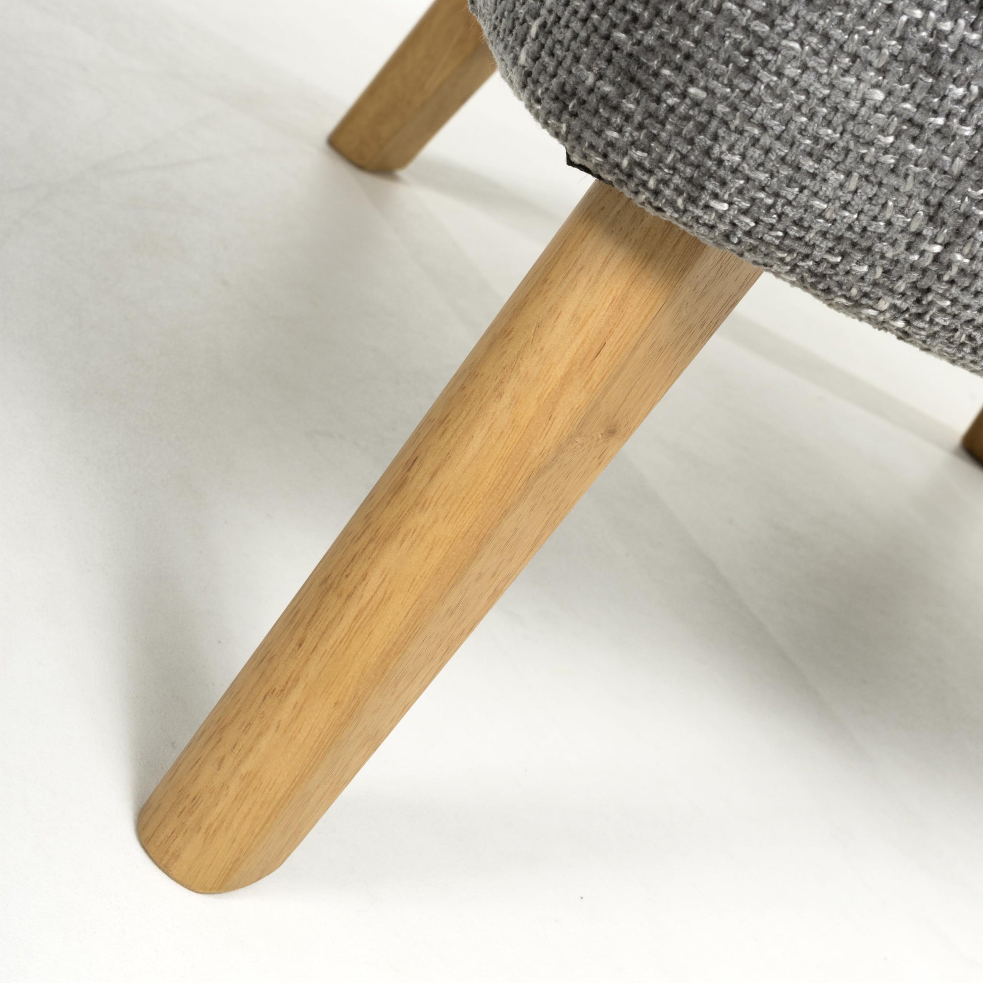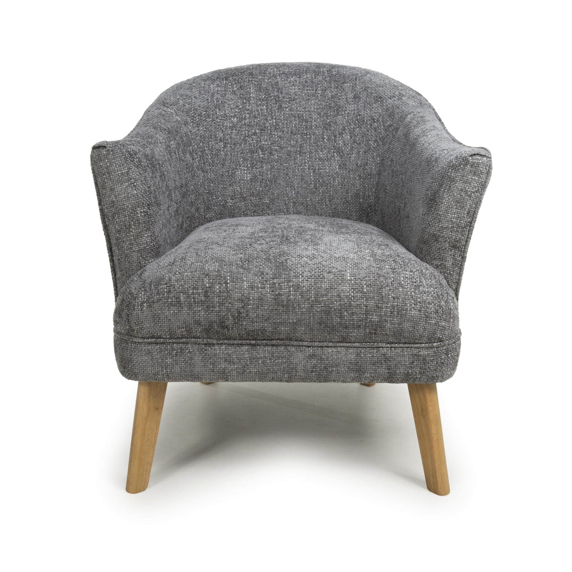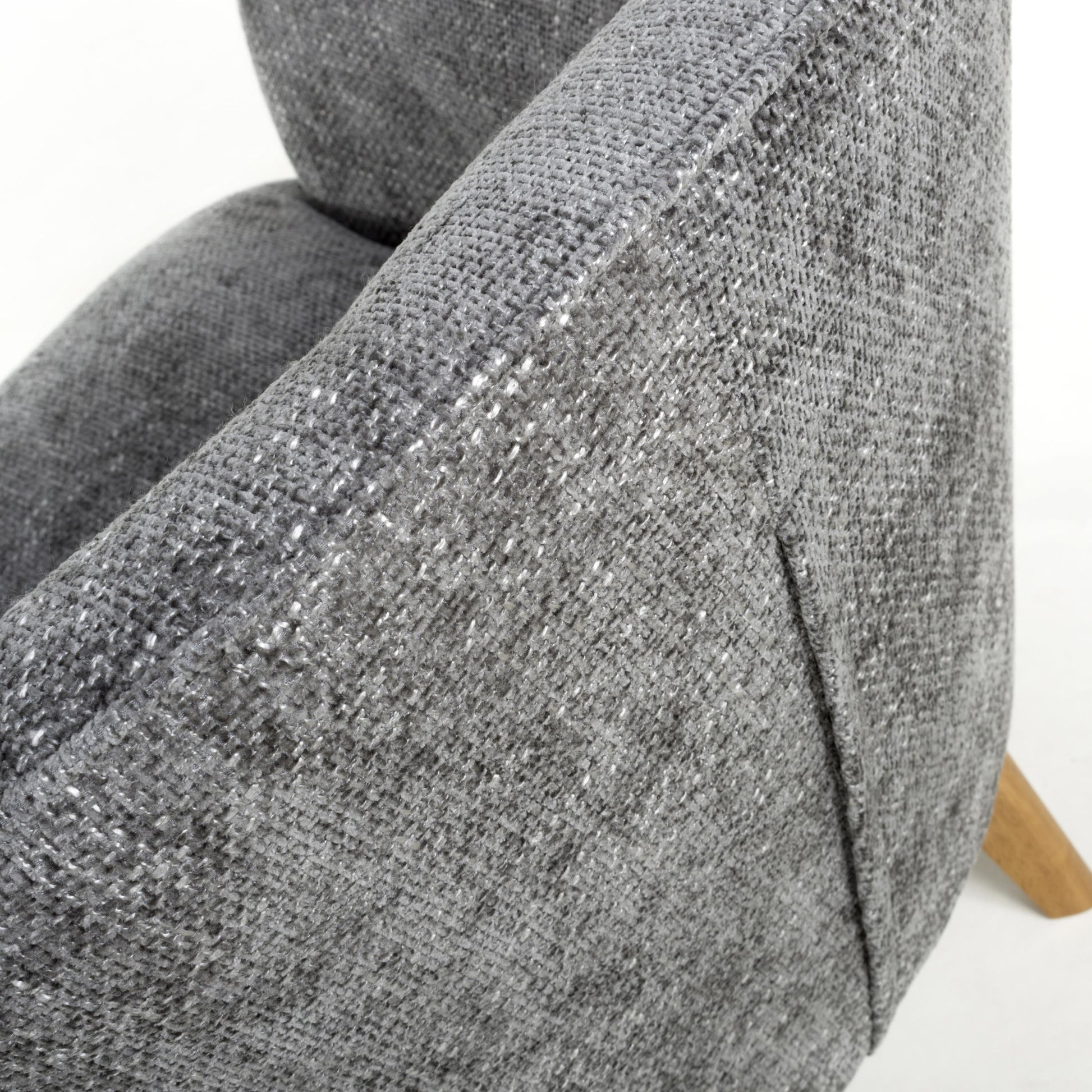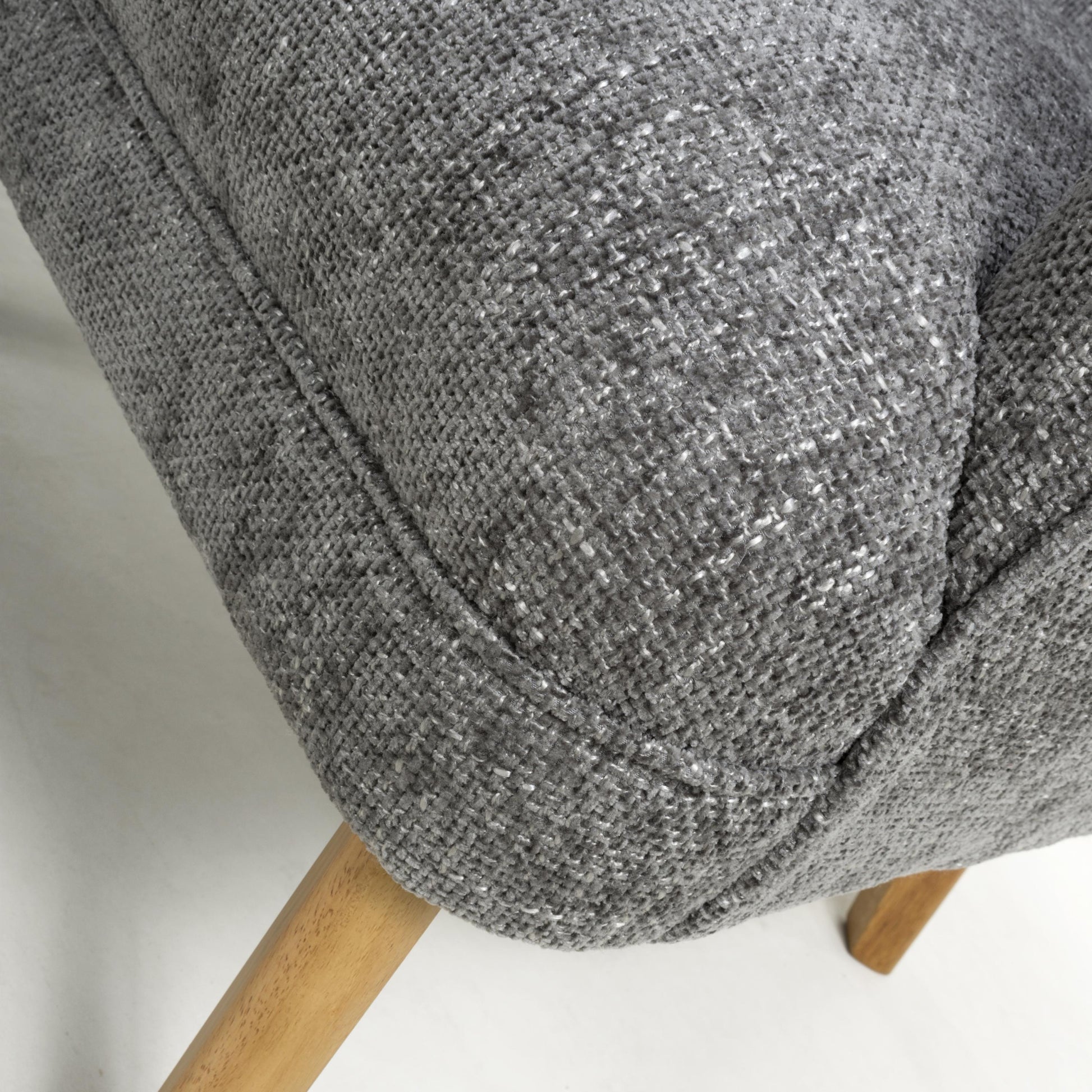 A curved wing armed armchair, upholstered in soft, tactile grey flax effect fabric. The gentle curves and sloped back combine with ample plush padded cushioning for the ultimate in comfort. Completed by sturdy natural rubberwood legs. Leg assembly required.