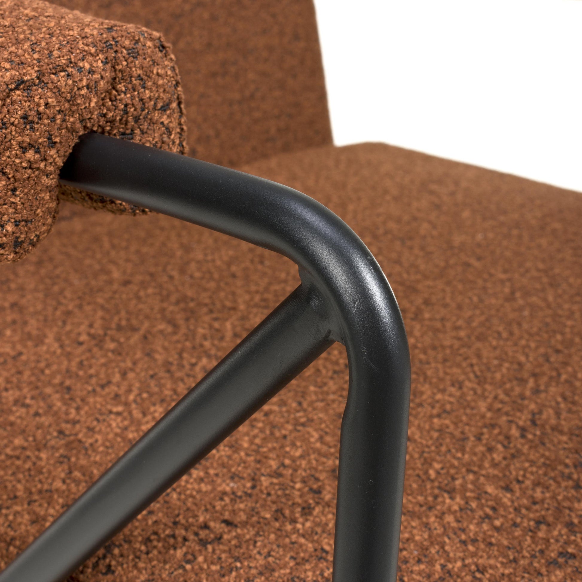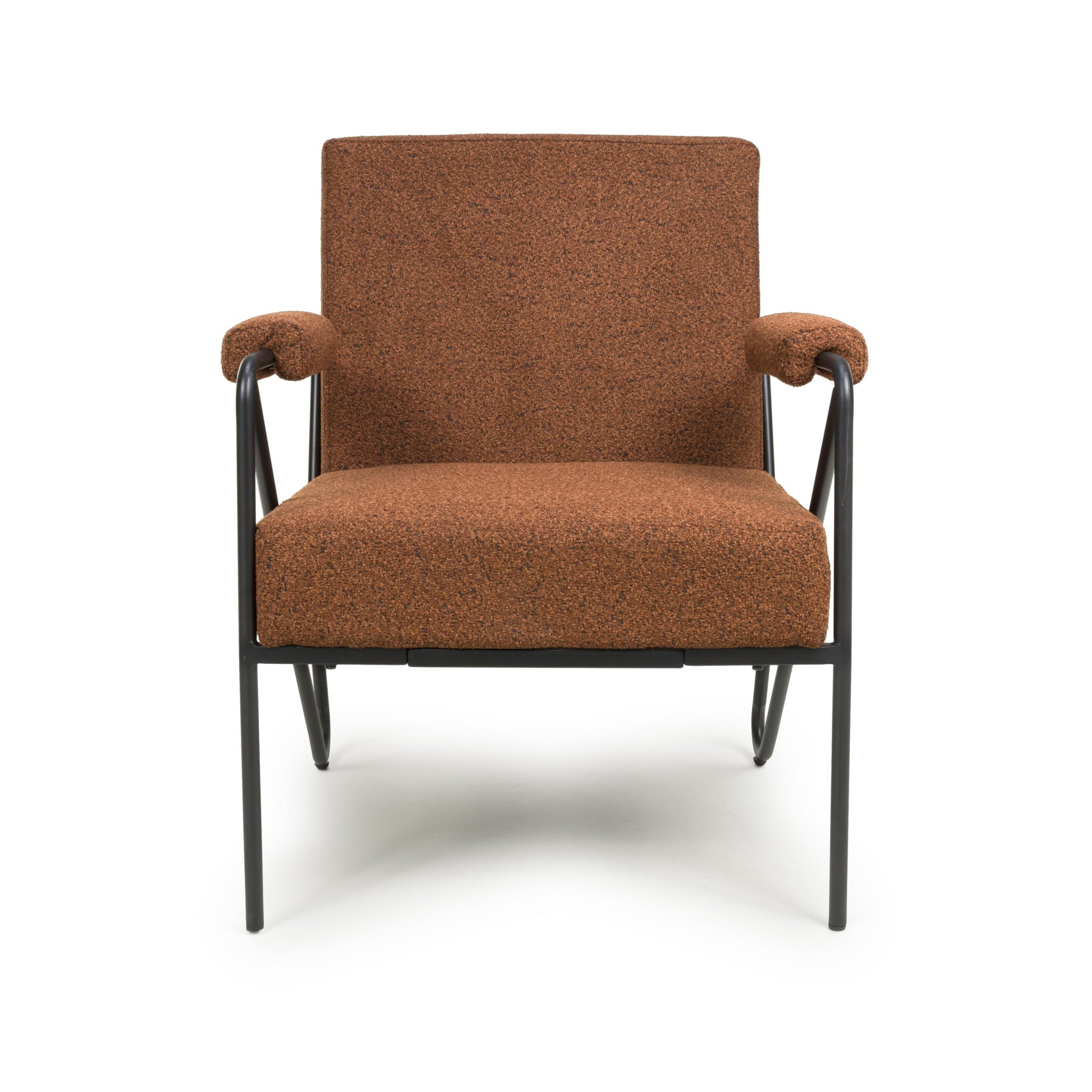 This armchair expertly blends luxurious comfort and modern industrial design. The deep seat, backrest and matching armrest pads are wrapped in tactile speckled burnt orange fabric. Its minimalist angular black metal frame cuts a sharp profile and provides excellent support. Assembly required. Sold individually.