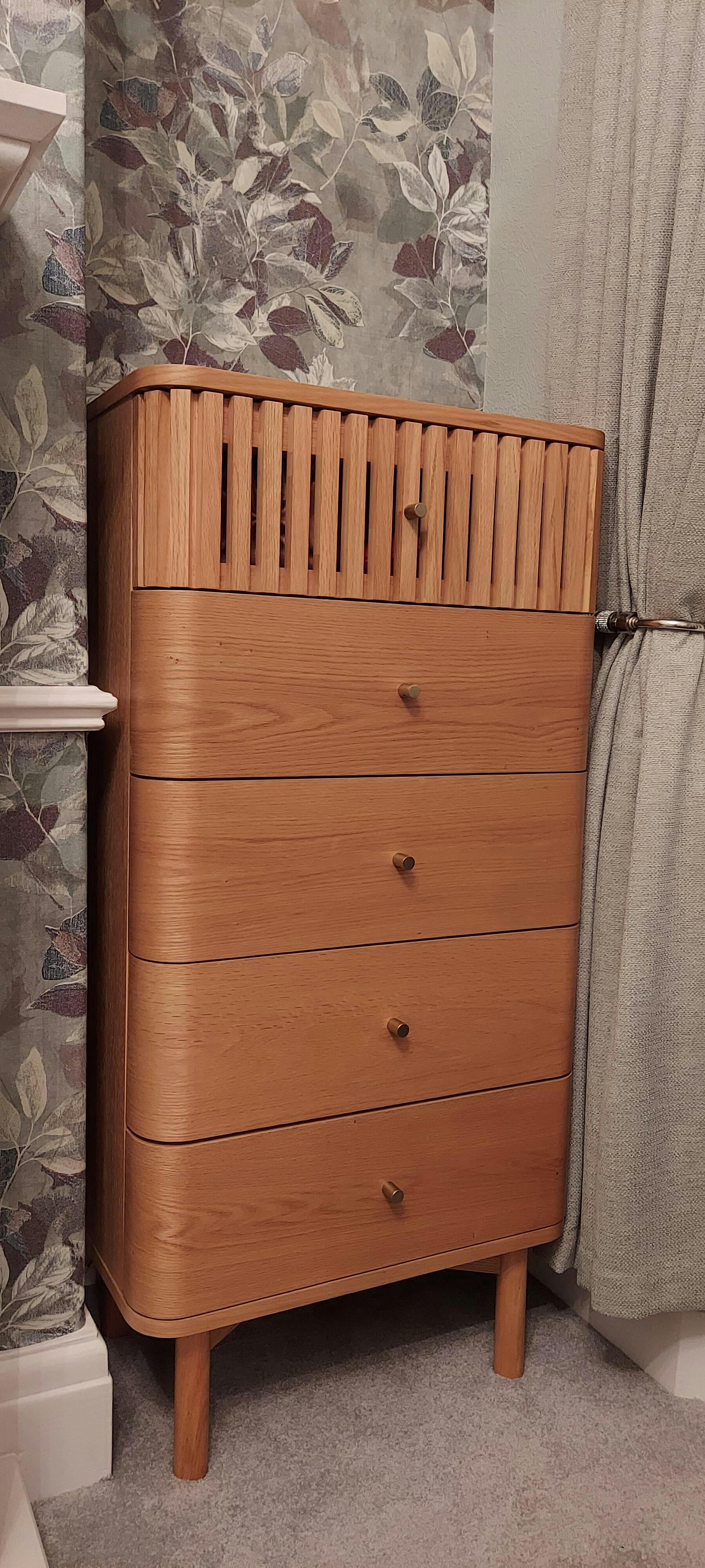 - Striking 5-drawer oak tallboy with slatted top drawer